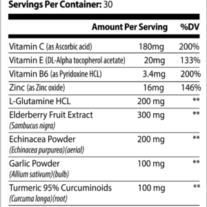 L-glutamine, elderberry extract, echinacea powder, garlic powder, and a specially selected strain of bacteria are among the ten carefully chosen ingredients. This product is vegetarian-friendly and suitable for anyone with a sensitive stomach or a damaged immune system.†